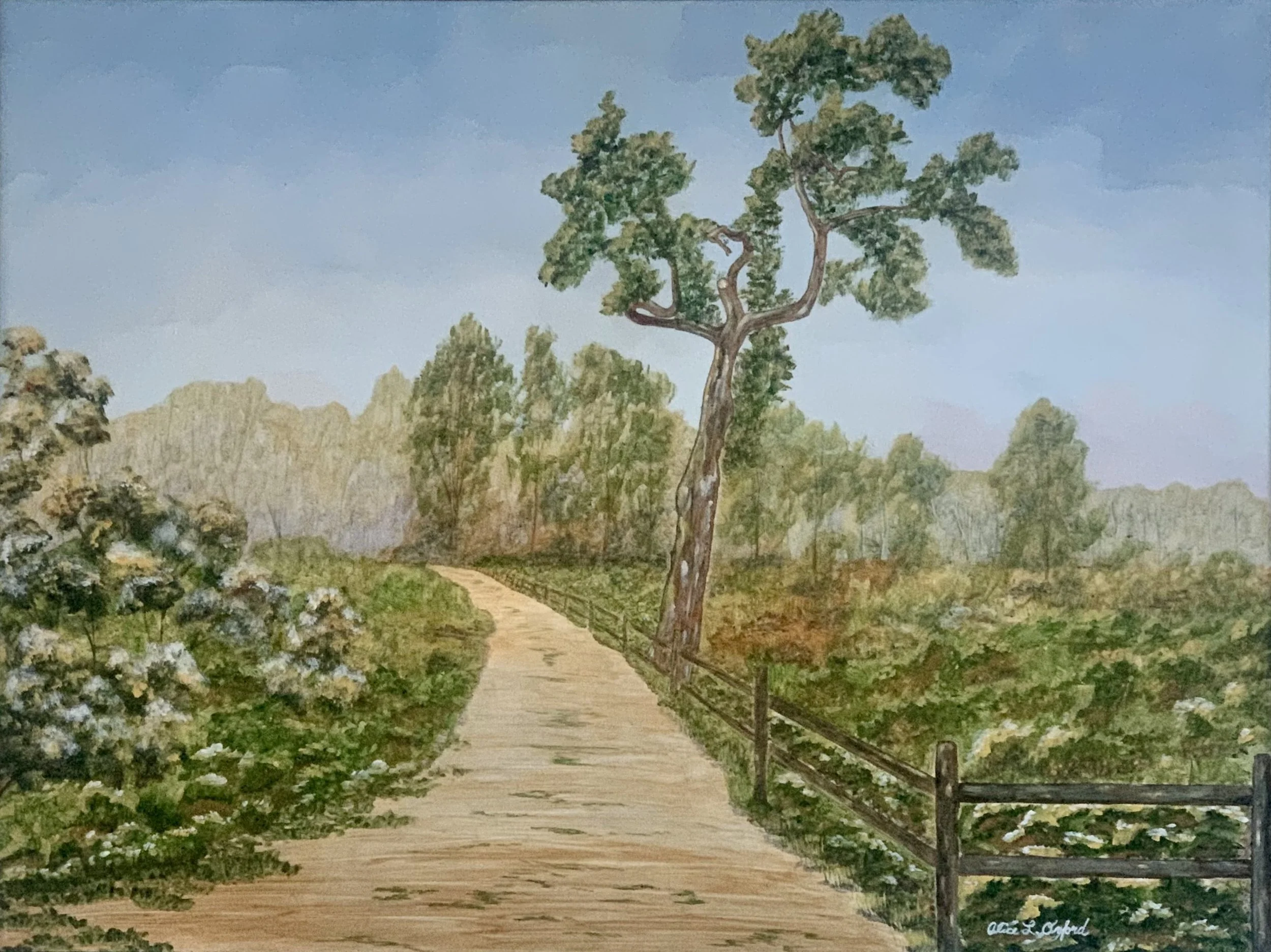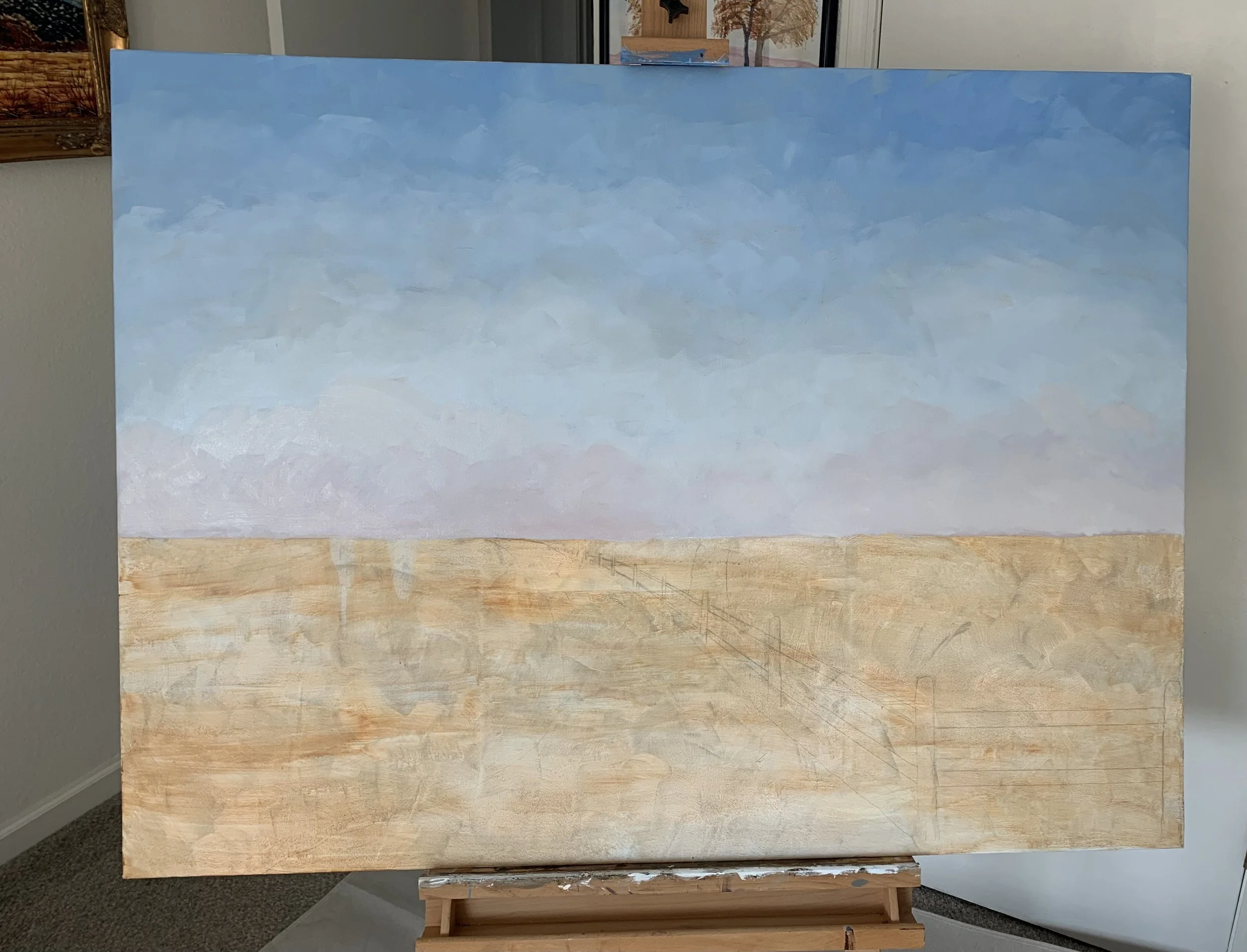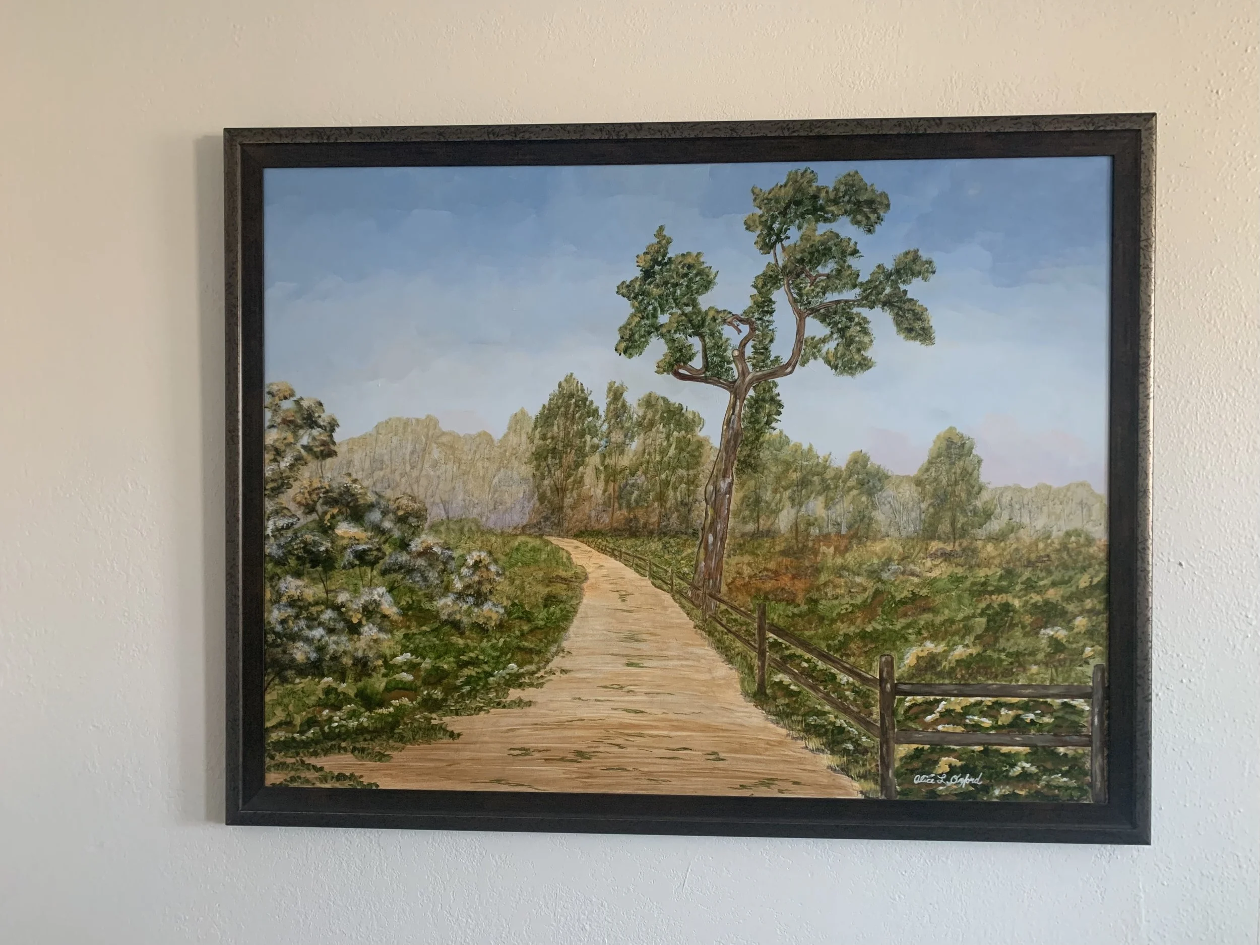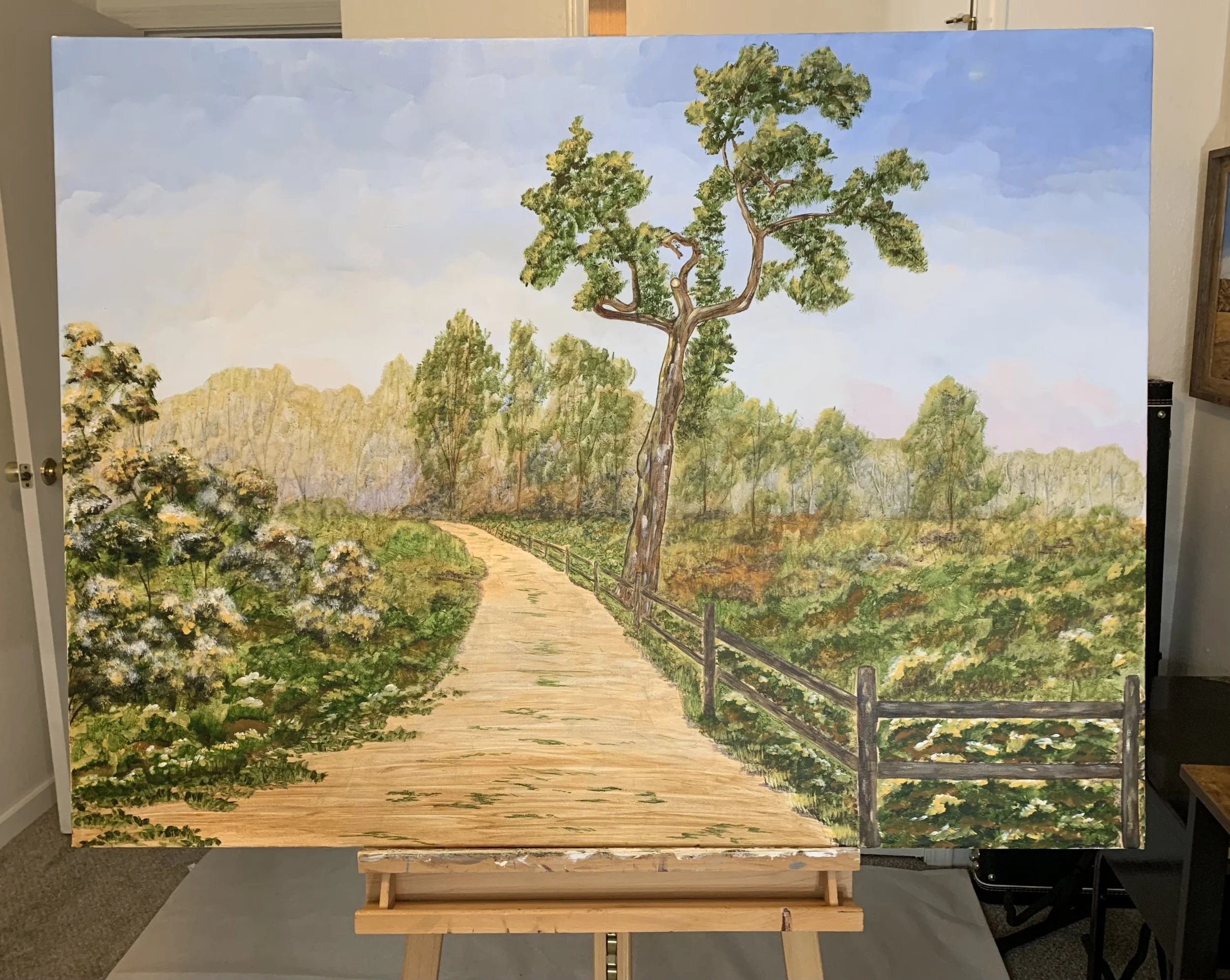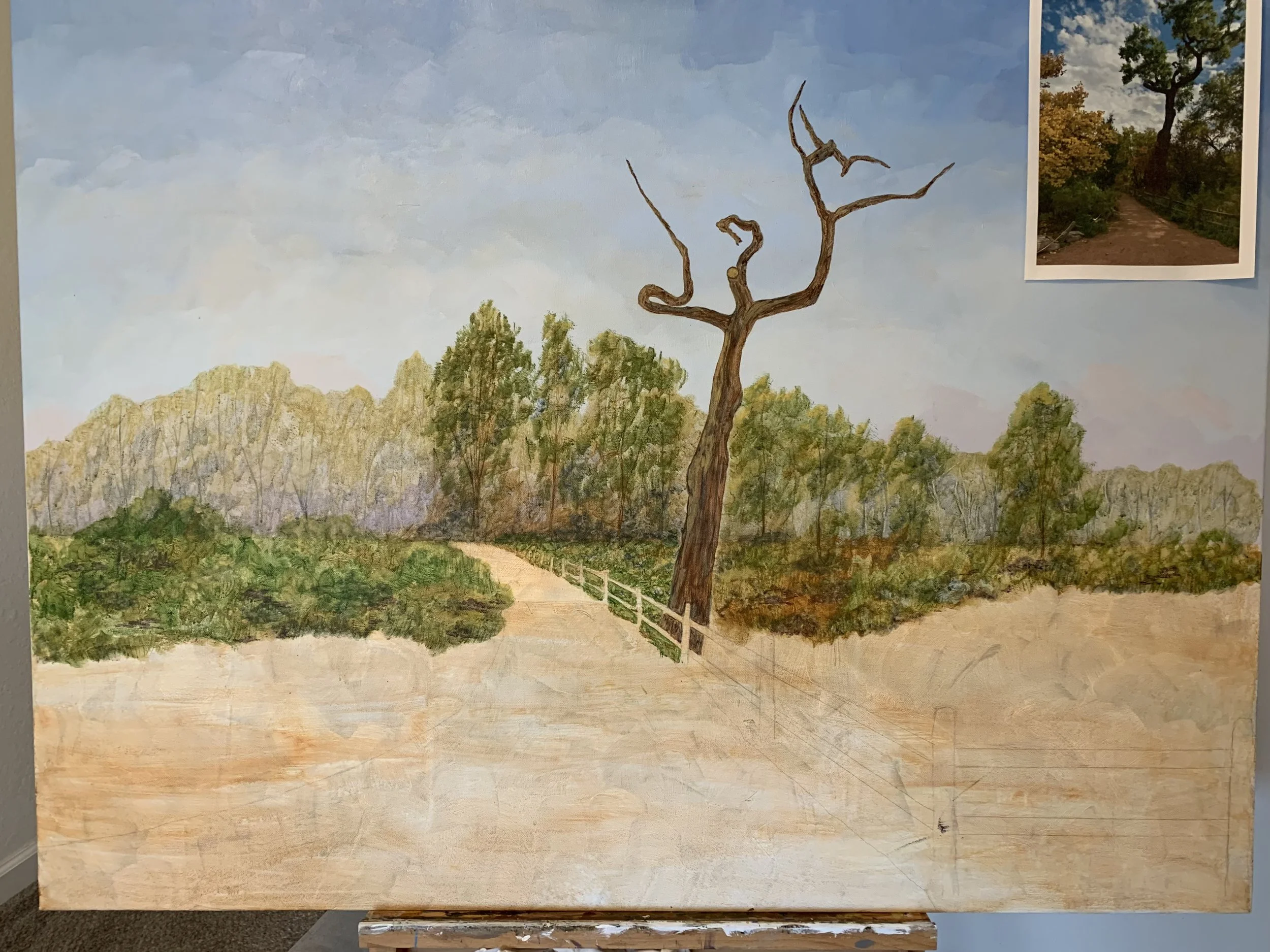 This scenic landscape was created from a photograph I took while on a walk at the Albuquerque, NM Botanic Garden. I spotted this tree and thought of how life can offer a second chance. This tree has been cut back, but found a way to grow again. Nature’s ability to thrive under harsh circumstances is inspiring! You can see a glimpse into my process below.