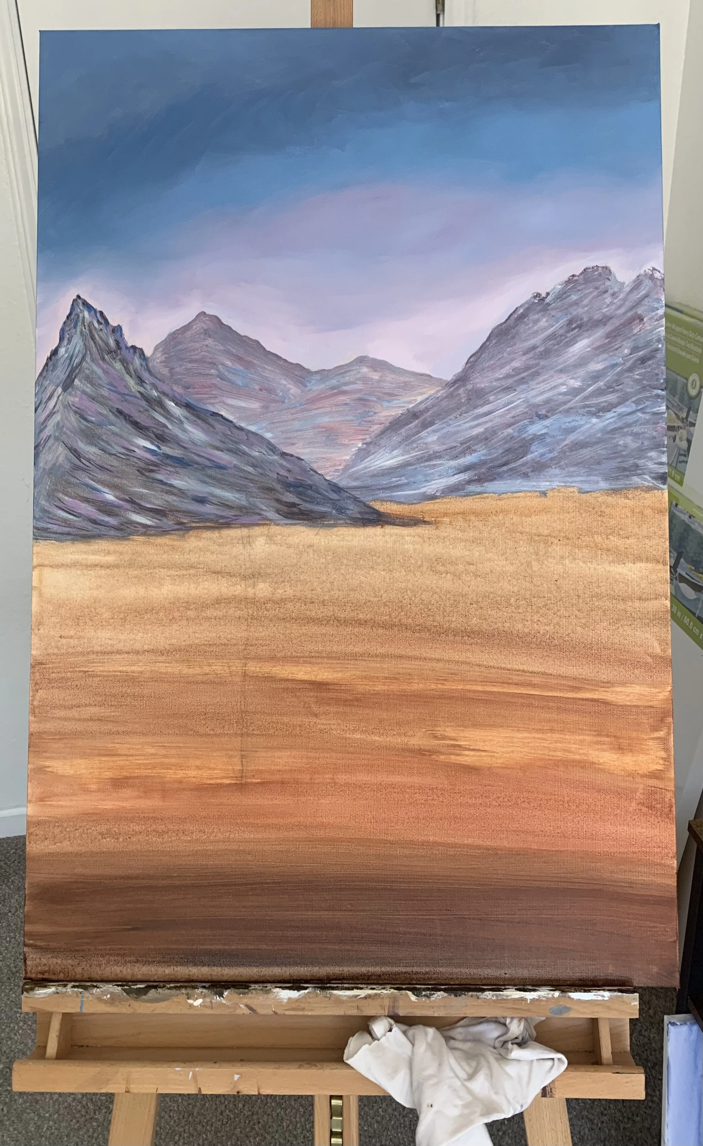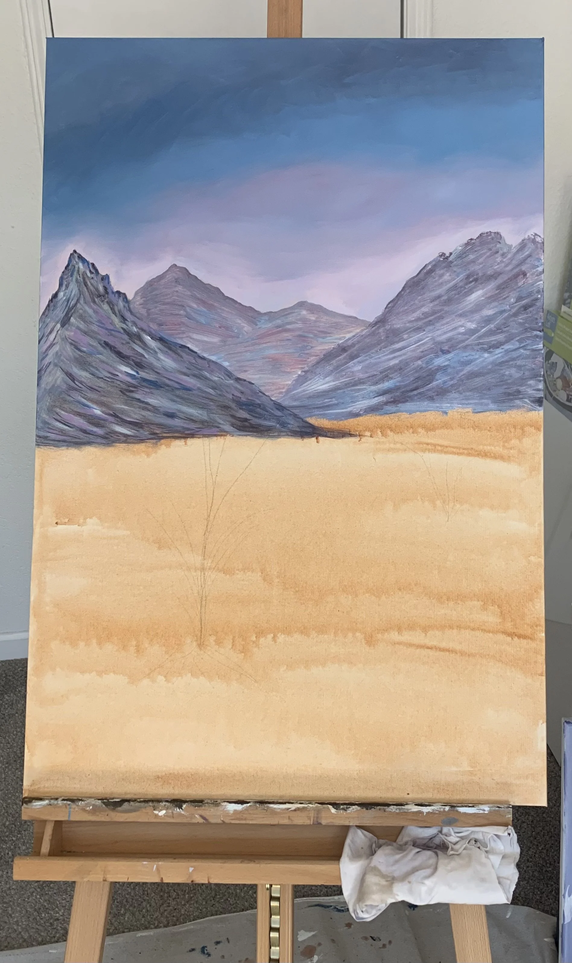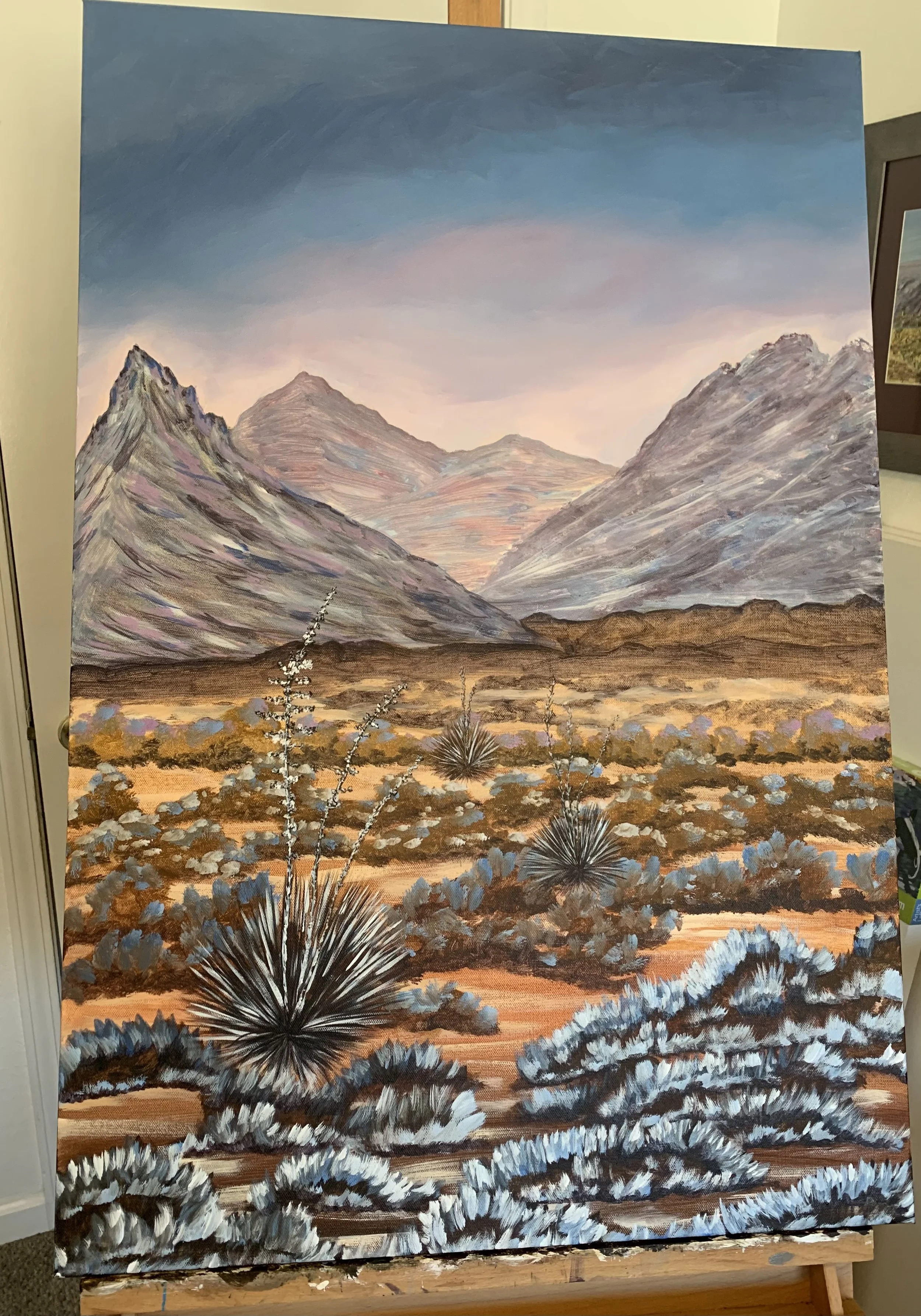 The yucca plant is the New Mexico state flower, and in the spring it brings forth thick clusters of white flowers. These flowering plants are so beautiful and diverse. I wanted to capture them in a whimsical way with fun colors and excitement. You can see below a glimpse into my process for this painting.